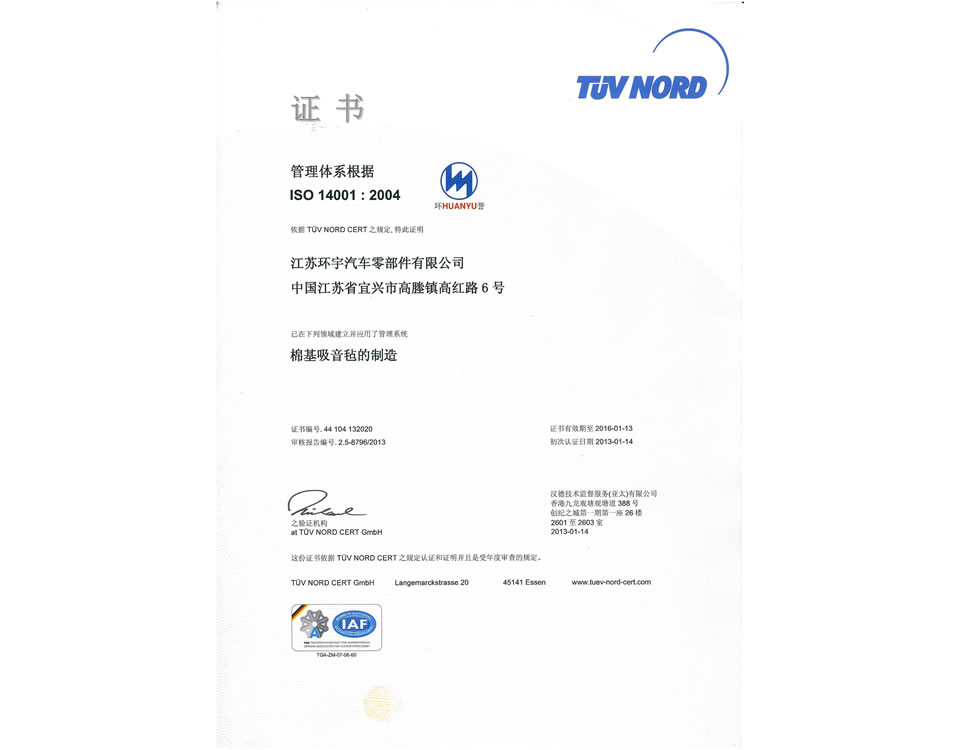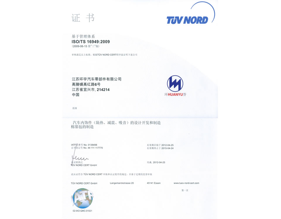 江蘇環宇汽車零部件有限公司成立于1997年的江蘇環宇汽車零部件有限公司,作為國內汽車隔音降噪產品的主要提供者之一,始終把技術、質量、安全和環保視為產品的核心價值,確保向客戶提供高品質的產品。公司于2004年通過了IS09001和ISO/TS16949認證,2011年通過ISO14001。